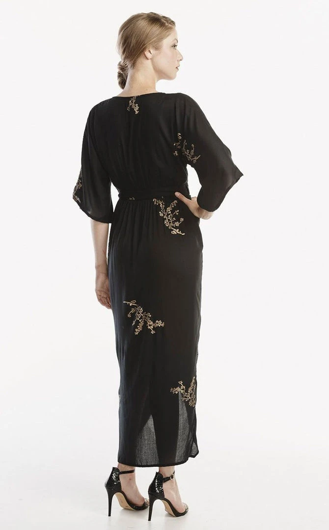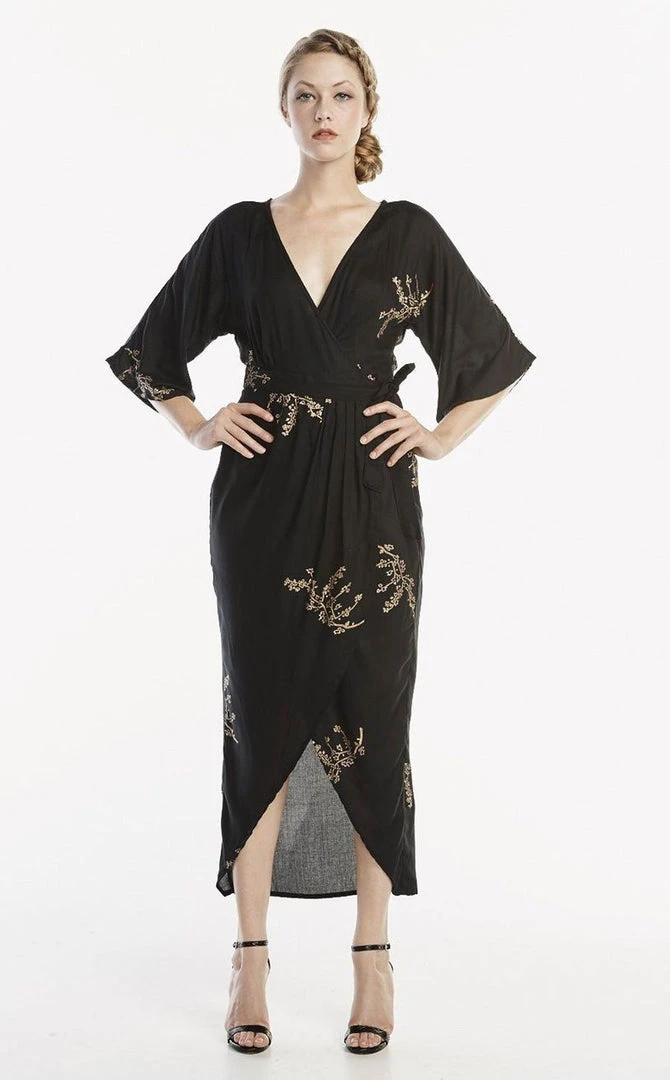 Make an entrance in Symbology’s super comfy, figure-loving wrap dress. The golden cherry blossom branches add an ethereal touch, sure to bring lots of compliments from admirers.In China, the cherry blossom symbolizes strength, beauty, and feminine sexuality–kinda all the things you’d want to embody when wrapping yourself in this gorgeous number.