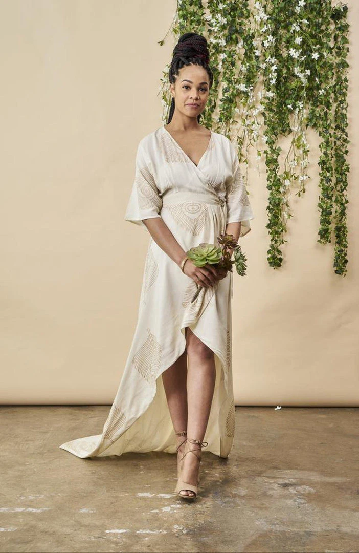 This body-loving, curve-hugging stunner of a wrap dress is hand-printed and beaded in luscious silky modal fabric (vegan-friendly). This wrap dress is sure to turn heads and garner copious compliments. In India, the peacock symbolizes beauty, kindness and good fortune. All things befitting for your wedding day.