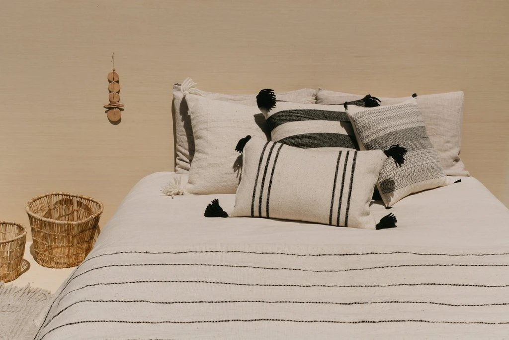 This soft, rustic, handwoven wool pillow is created in Central Mexico. The wool is sourced locally and the dying and weaving is done in the family-run workshop in the Sierra Norte Mountains.