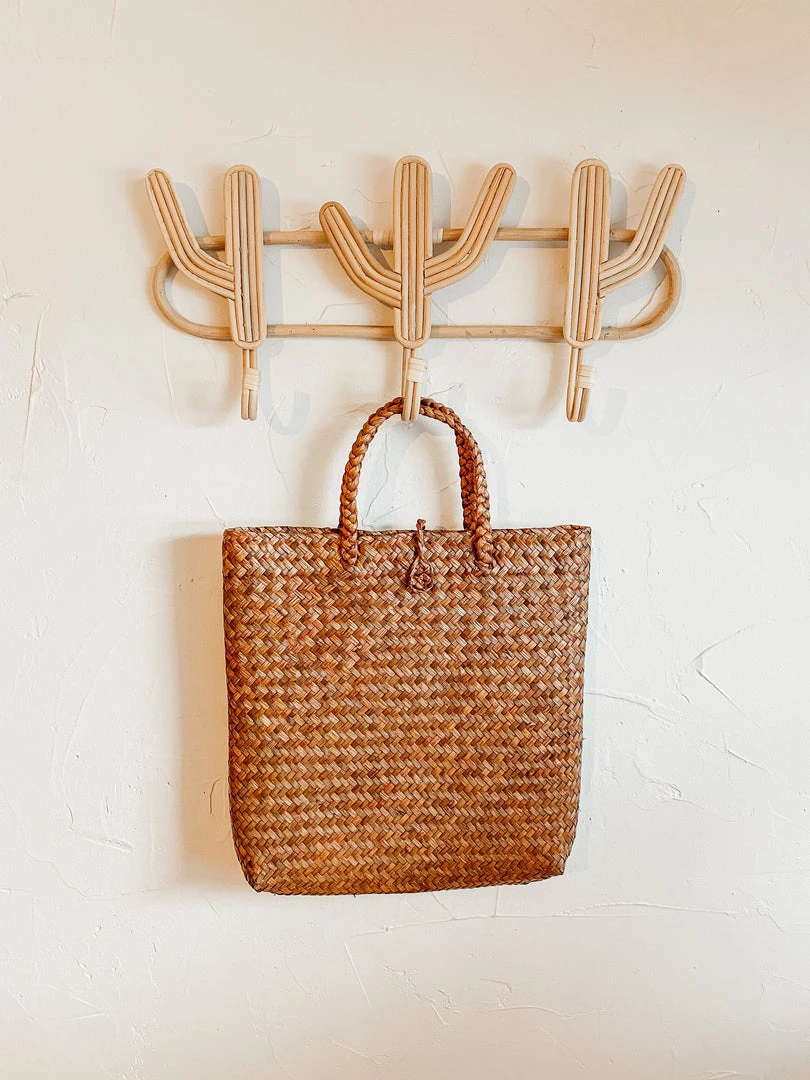 The Amber Woven Tote is casual and functional while showcasing artisanal weaving and natural materials. This tote is strong enough for your books, wide enough for a plant and could not be any cuter.