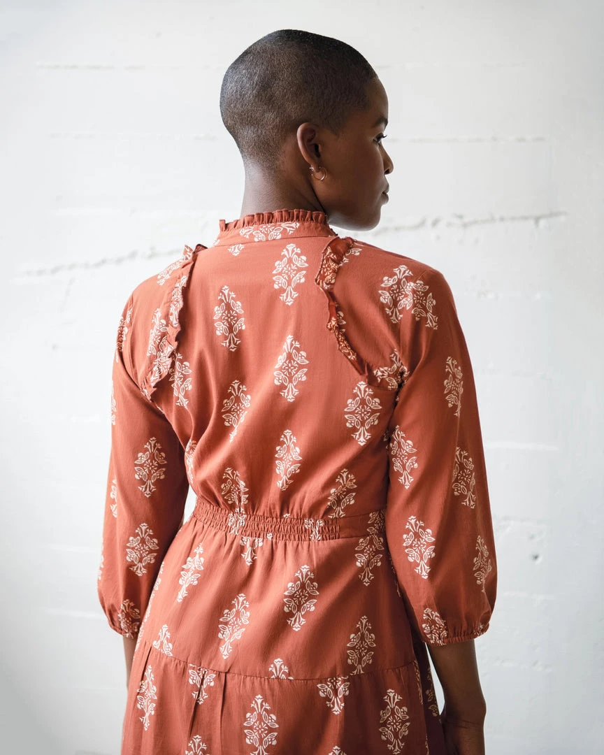 An artful and elegant addition to every woman’s wardrobe. The Aurelia Dress, accented with coy ruffled details at the collar and shoulder, is meticulously tailored and hand-printed with a floral block-print design. Falls just below the knee and made from organic cotton voile.