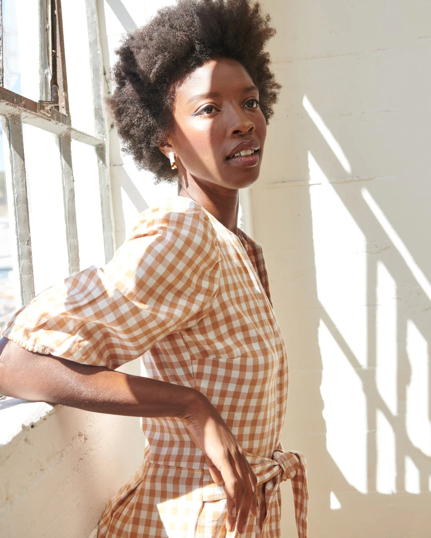 The Amber jumpsuit is a breezy Gingham jumpsuit with clean lines a sleek details, featuring a front tie belt at the waist and subtle feminine puff-sleeve detailing. Made of ultra-fine 100% organic cotton — a minimalist design with maximum effect.