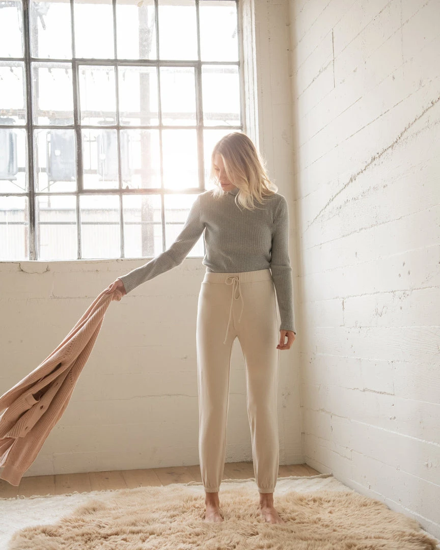 The Throw On Pant is made with supple, buttery-soft cotton and modal fabric. Features a drawstring tie, elastic banding at the cuffs and waist, and slightly tapered silhouette.
