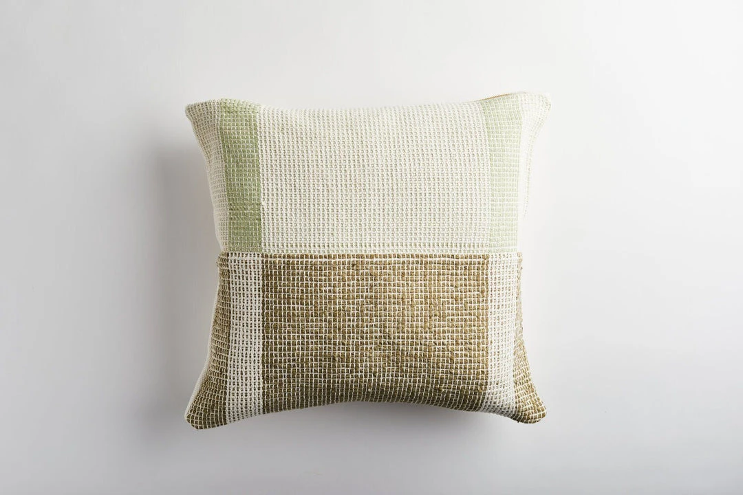 These handwoven pillow covers showcase a block weave and large geometric shapes. The contrasting textures will add softness and warmth to any room. Inspired by the colors and textures of a páramo, an ecosystem 3,000 m above sea level in the Andean region of South America. It’s low temperatures allows for special plant life to collect rainwater through their leaves and root systems.